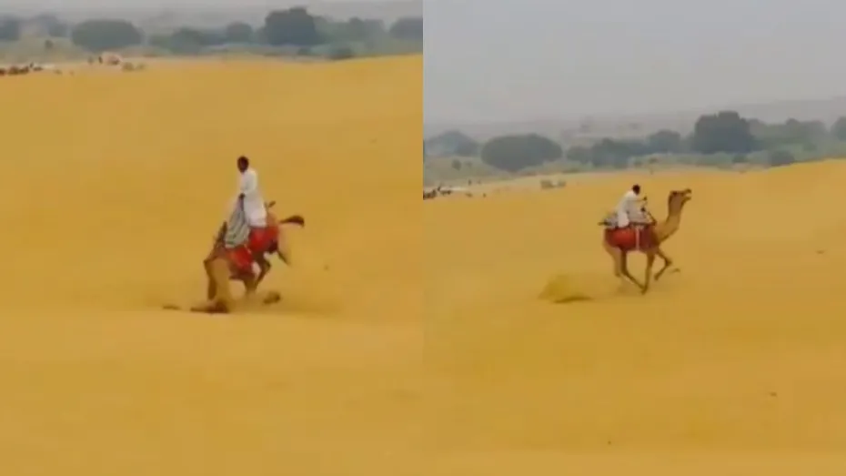 आज के समय में हर किसी को रील्स बनाने की आदत हो गई है। लोग कहीं भी घूमने जाते हैं तो वहां रील्स बनाने लगते हैं और कुछ समय बाद उसे पोस्ट कर देते हैं। इतना ही नहीं कई बार तो लोग अपने घर पर बैठकर ही रील्स बनाने लगते हैं। कुल मिलाकर बात यह है कि आजकल हर दूसरा इंसान आपको रील्स बनाता हुआ मिल जाएगा। इसी तरह एक शख्स ने सोचा कि जब वह ऊंट की सवारी करेगा तो उसे रिकॉर्ड करके रील बनाएगा। मगर इसी दौरान कुछ ऐसा हुआ जिसे देखने के बाद आप हंसने को मजबूर हो जाएंगे। वीडियो सोशल मीडिया पर काफी वायरल हो रहा है।