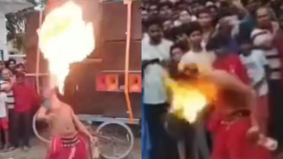 एक वीडियो अभी वायरल हो रहा है जिसमें एक शख्स लोगों को करतब करके दिखा रहा है। उसके करतब देखने के लिए वहां भारी संख्या में लोग भी जमा हुए हैं। इसी दौरान वह शख्स अपने मुंह में पेट्रोल रखता है और उसके बाद आगे के एक छोटे गोले को आसमान में उछालता है। आग का गोला जैसे ही उसके चेहरे के ठीक सामने आता है वो पेट्रोल वाली फूंक मारता है जिससे आग का एक फव्वारा जैसा बनता। लेकिन ऐसा करना उसे भारी पड़ गया और उसका चेहरा आग से जल जाता है। इसके बाद वो खुद को बचाता हुआ नजर आता है।
