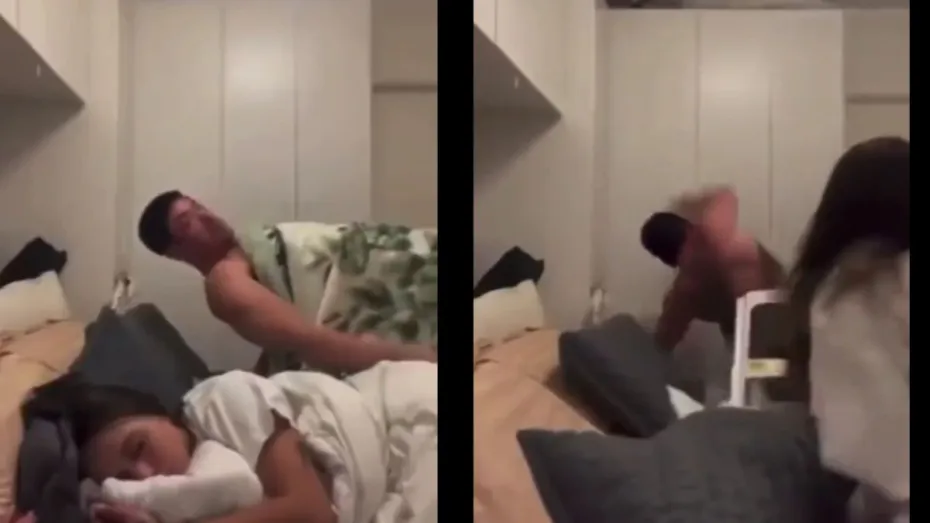 वायरल हो रहे वीडियो में आप देखेंगे एक शख्स अपने बिस्तर पर हवा में लटका हुआ है। शख्स अपनी पार्टनर को देखता है और फिर एक्टिंग करना शुरू कर देता है। वो अपने मुंह से कुछ ऐसी आवाजें निकालता है जैसे मानों उसके शरीर में कोई आत्मा आ गई हो। आवाज सुनने के बाद उसके बगल में सो रही लड़की उठ जाती है और उस शख्स की तरफ देखती है जो हवा में लटका हुआ होता है। ऐसा देखते ही वो लड़की डर जाती है और फिर उसे भगाने के लिए जो कुछ भी उसके हाथ में आता है, उसे फेंककर मारती है। कुछ देर बाद लड़की उस शख्स को धक्का दे देती है जिससे उसकी पोल खुल जाती है। वो शख्स एक हवा में नहीं लटका होता है बल्कि एक टेबल पर लेटा होता है। इसके बाद क्या था? शख्स की पोल खुलने के बाद लड़की उससे गुस्सा हो जाती है और फिर उसकी अच्छे से पिटाई करती है।