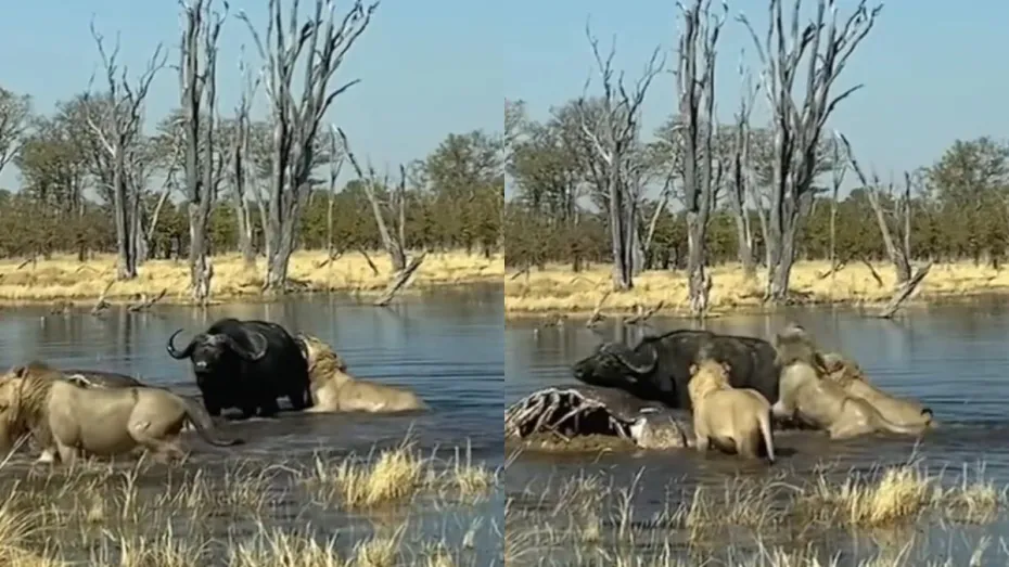 एक पल के लिए तो लगता है कि तीनों मिलकर भैंसे को निपटा देंगे। लेकिन भैंसा कहां हार मानने वाला था आखिर उसके जीवन का सवाल था। एक प्वाइंट पर भैंसा पहले दो शेरों को भगा देता है लेकिन तीसरा शेर पीछे से आकर उसकी पूंछ को दबोच लेता है। भैंसा पीछे मुड़कर उसे अपने सिंग से उठाकर पटक देता है। शेर थोड़ी देर के लिए थम जाता है फिर अचानक से वह दोबारा भैंसे के ऊपर हमला कर देता है और भैंसे के मुंह को दबोच लेता है।