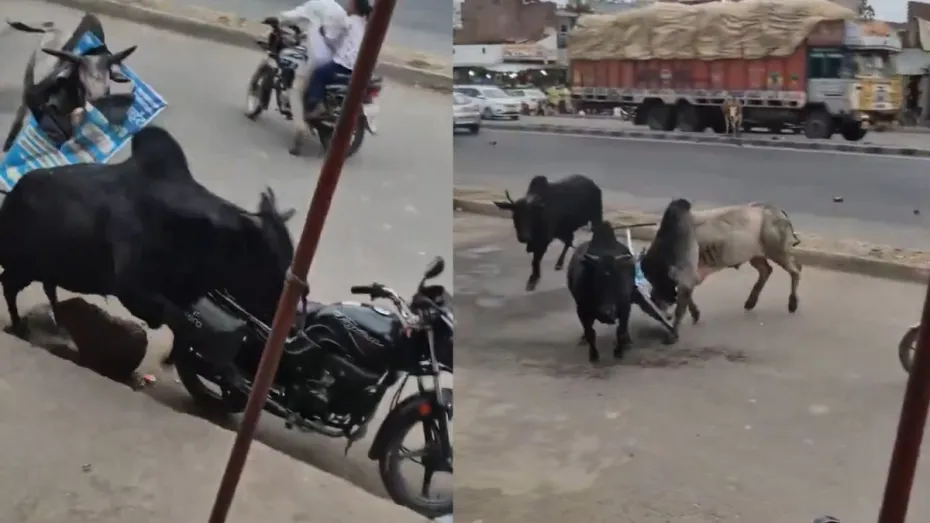 हाईवे पर तीन सांडों की भयंकर लड़ाई