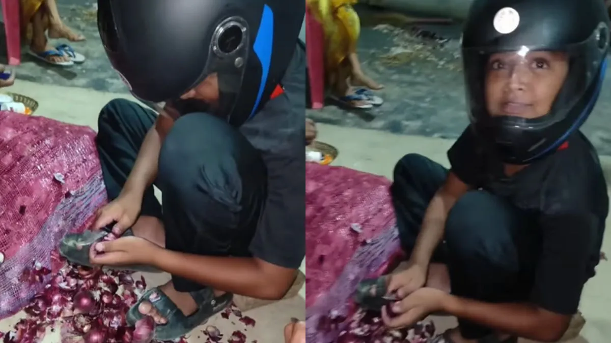 प्याज एक ऐसी चीज है जिसे काटना आसान काम नहीं है। प्याज को काटते समय अधिकतर लोगों के आंखों से आंसू निकल जाते हैं क्योंकि प्याज आंखों में लगते हैं। वहीं जब बहुत सारे प्याज काटने हो, या फिर छीलने हों तो फिर तो लोग सोचने पर मजबूर हो ही जाएंगे। लेकिन एक बच्चे ने अपने दिमाग का गजब इस्तेमाल किया जिसका वीडियो अभी वायरल हो रहा है। अभी जो वीडियो वायरल हो रहा है उसमें नजर आता है कि एक बच्चा दूसरे लोगों के साथ प्याज छीलने और काटने के लिए बैठा हुआ है लेकिन उसकी आंखों में जलन न हो, इसके लिए उसने हेलमेट पहन लिया है। और यही कारण है कि वीडियो वायरल हो रहा है।