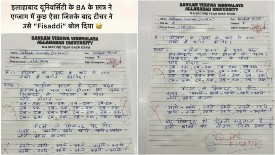 दरअसल जो पोस्ट वायरल हो रहा है उसके मुताबिक यह मामला इलाहाबाद विश्वविद्यालय का है। आंसरशीट पर साफ-साफ इलाहाबाद विश्वविद्यालय का नाम लिखा गया है। इस आंसरशीट में छात्र ने ऐसा उत्तर लिखा है कि टीचर ने फ्रस्ट्रेशन में छात्र के लिए जो फेल शब्द लिखा था, उसे काटकर फिसड्डी लिख दिया। आंसरशीट के ही मुताबिक, परीक्षा बीते 14 अक्तूबर को हुई थी। इस परीक्षा में सवाल पूछा गया था, "झेलम के युद्ध के बारे में 300 शब्दों में वर्णन कीजिए?" आशीष कुमार नाम के छात्र ने इस सवाल का आजीबों-गरीब और हास्यास्पद जवाब दिया है। आशीष कुमार ने ऐसा लिखा है जिसका जवाब वायरल हो रहा है।