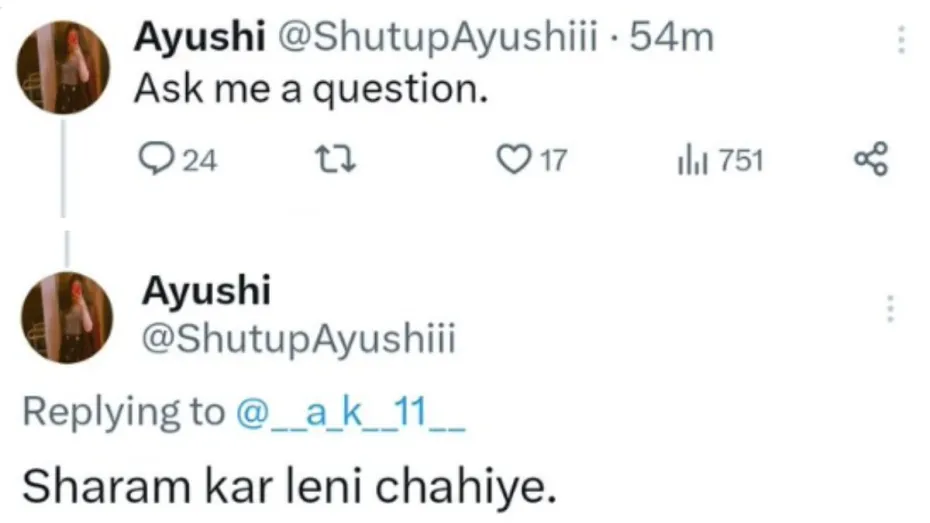 माइक्रो ब्लॉगिंग प्लेटफॉर्म एक्स (पहले ट्विटर) पर एक पोस्ट काफी तेजी से वायरल हो रहा है। इस पोस्ट में लड़की ने स्क्रीनशॉट शेयर किया है। आप पोस्ट में पढ़ सकते हैं कि लड़की ने 'Ask me a question' लिखकर ट्वीट किया। यह पढ़ने के बाद एक यूजर ने उससे सवाल किया, 'एक लड़की के लिए मन में फीलिंग' है लेकिन उसका पहले से एक बॉयफ्रेंड है, मुझे क्या करना चाहिए? यह सवाल देखते ही लड़की भड़क गई और शानदार जवाब दिया। उसने लड़के को रिप्लाई देते हुए लिखा, 'शर्म कर लेनी चाहिए।' इस पोस्ट को पढ़कर लोग सोशल मीडिया पर खूब मजे ले रहे हैं।