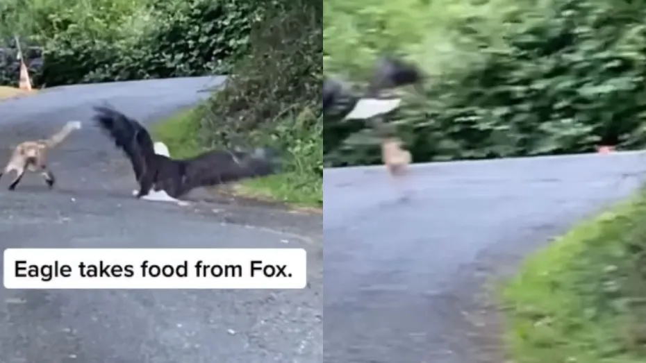 वायरल इस वीडियो में आप देख सकते हैं कि सड़क पर एक लोमड़ी अपने मुंह में खाना दबाकर जा रही है। तभी उसने हवा में अचानक कुछ ऐसा देखा कि उसकी हालत खराब हो जाती है और उसके मुंह से खाना गिर जाता है। तभी वहां चील आती है और उसका खाना अपने चोंच में दबाकर उड़ जाती है। चील को देखने के बाद लोमड़ी डर गई थी इसलिए उसकी हिम्मत नहीं हुई की उसके पास जाए। जैसे ही चील उड़ती है लोमड़ी अपना खाना लेने के लिए उसके पीछे भागती हुई दिखती है। इस वीडियो को लोग काफी पसंद कर रहे हैं।