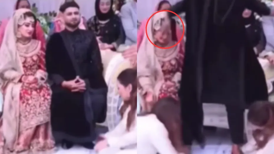 सोशल मीडिया पर वायरल हो रहे वीडियो को देखने के बाद आपको समझ में नहीं आएगा कि इसे देखकर हंसें या फिर दुल्हन के लिए बुरा फील करें। वायरल वीडियो में आप देख सकते हैं कि दूल्हा और दुल्हन एक साथ बैठे हुए हैं। तभी उनकी दूल्हे की सालियां वहां आकर उसके पैर से जूता निकालने लगती हैं। अपने जूतों को बचाने के लिए दूल्हा जैसे ही खड़ा होता है उसका बैलेंस बिगड़ जाता है। ऐसे में खुद को बचाने के लिए दूल्हा अपने हाथों को पीछे करता है। मगर गलती से पीछे बैठी दुल्हन के चेहरे पर उसका हाथ चाटे जैसा जा लगता है। दुल्हन भी जानती है कि यह गलती से हुआ है इसलिए कुछ नहीं कहती है और अपने नाक को सहलाने लगती है।