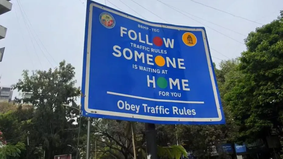 सोशल मीडिया पर बृहत बेंगलुरु महानगर पालिका द्वारा सड़क पर लगाए गए एक साइनबोर्ड की तस्वीर काफी वायरल हो रही है। इस बोर्ड को जब आप पहली बार देखेंगे तो 'Follow Someone Home' लिखा हुआ नजर आएगा क्योंकि यह बड़े अक्षरों में लिखा हुआ है। इसे पढ़कर आपको थोड़ा अजीब लगेगा। मगर जब आप इसे ध्यान से पढ़ेंगे तो इस पर लिखा हुआ असली मैसेज आपको पता चलेगा। इस बोर्ड पर लिखा हुआ है कि, 'ट्रैफिक के नियमों का पालन करें, कोई आपके लिए घर पर इंतजार कर रहा है।' इसके नीचे 'ट्रैफिक नियमों का पालन करें' लिखा हुआ है।