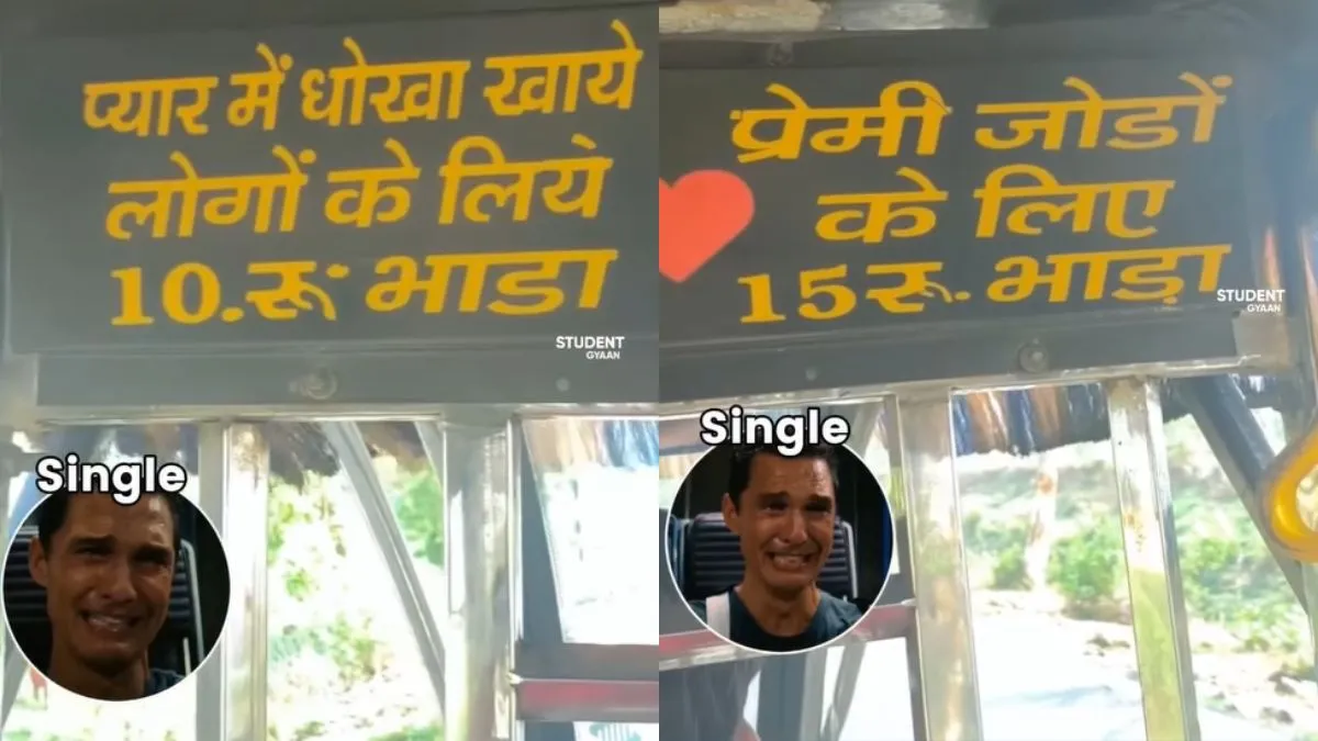 सोशल मीडिया पर वायरल हो रहा यह पोस्ट इतना मजेदार है कि इसे देखने के बाद सिंगल लोग खुशी से झूम उठे। वायरल पोस्ट में एक रिक्शे की तस्वीर शेयर की गई है। जिसके पीछे एक तरफ बड़े-बड़े अक्षरों में लिखा है- "प्यार में धोखा खाए लड़कों के लिए किराया 10 रुपये" और दूसरी तरफ लिखा है- कपल्स के लिए किराया 15 रुपये है। रिक्शे वाले का यह ऑफर सिंगल लोगों खासकर "दिल टूटे" युवाओं को लुभाने के लिए था। पोस्ट के कैप्शन पर नजर डालें तो उसमें लिखा था, "सिंगल लोगों का असली दोस्त मिल गया।"