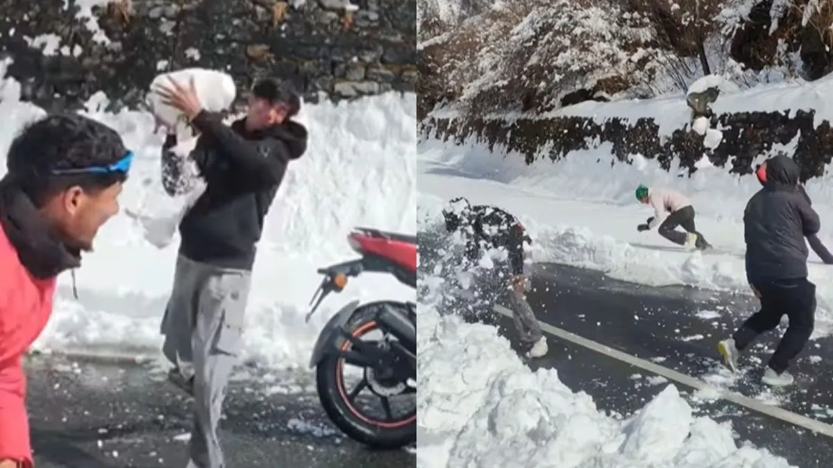 अभी जो वीडियो वायरल हो रहा है उसमें नजर आता है कि एक जगह पर बर्फबारी के बाद गजब का नजारा हो गया है। सड़क से बर्फ को किनारे कर दिया गया है और वहां गजब का व्यू दिख रहा है। वीडियो में आगे दिखता है कि एक बंदा पहले से ही बर्फ उठाए हाथ में खड़ा है और स्कूटी पर आते लड़कों पर फेंकता है। इसके बाद वो रुक जाते हैं और पीछे से आ रहे बाइक वाले भी रुक जाते हैं। फिर शुरु होता है बर्फ का खेल। वो बर्फ से मजे करते नजर आते हैं और इसी कारण उनका वीडियो वायरल हो गया।