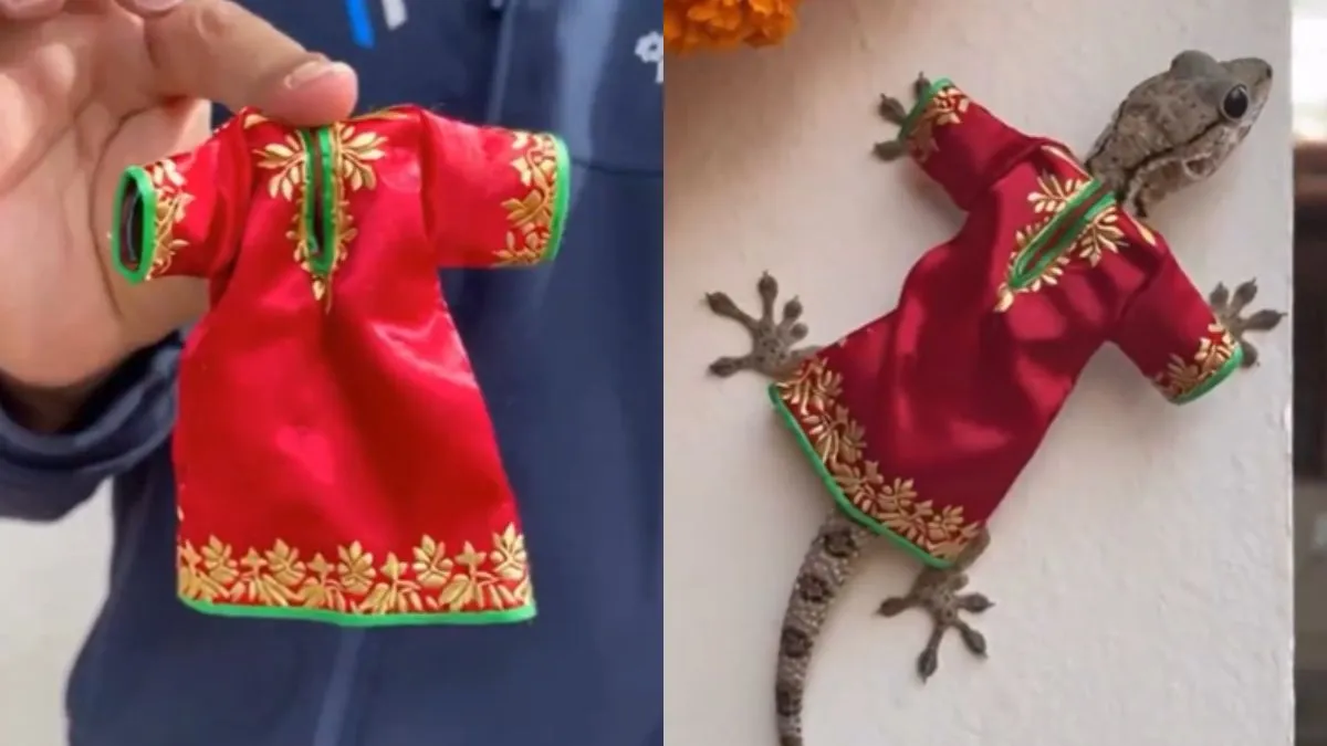आप जब सड़क पर निकलते होंगे तो कई सारी दुकानें दिखती होंगी जिसमें से कुछ कपड़े की भी दुकानें रहती होंगी और वहां आपको इंसानों के लिए एक से बढ़कर एक डिजाइन वाले कपड़े दिखते होंगे मगर क्या आपने कभी छिपकली के लिए कोई ड्रेस देखी है? वायरल हो रहे वीडियो में नजर आता है कि एक बंदे ने छिपकली के लिए ड्रेस बनाई है और वो उसमें से एक ड्रेस छिपकली को पहनाता भी है, जो वीडियो में दिखता है। पहले तो लोग छिपकली की ड्रेस देखकर हैरान हुए और फिर यह सोचकर कि छिपकली को यह पहनाएगा कैसे कोई। आप भी वायरल वीडियो देखिए।