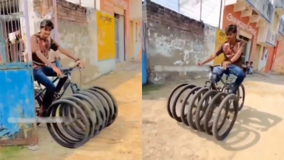आपने अब तक कई तरह के साइकिल देखे होंगे। कुछ समय पहले सोशल मीडिया पर एक अनोखे साइकिल का वीडियो वायरल हुआ था जिसके पहिए गोल न होकर चौकोर थे। अब उसके बाद आज एक नया वीडियो देखने को मिला। अभी जो वीडियो वायरल हो रहा है उसमें नजर आता है कि बंदे ने एक ही साइकिल में कई सारे पहिए जोड़ लिए हैं। उसने आगे वाले पहिए के साथ 6 और पहिए लगा दिए हैं। वहीं पीछे वाले पहिए के साथ 2 और पहिए लगा दिए हैं। इसके बाद वो उस साइकिल को चलाते हुए भी नजर आता है। इसी जुगाड़ के कारण वीडियो वायरल हो रहा है।