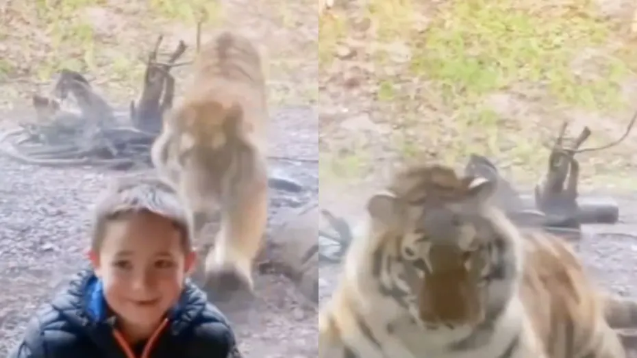 सोशल मीडिया पर वायरल होने वाला यह वीडियो आपको अचंभित कर सकता है। वीडियो में आप देख सकते हैं कि एक बच्चा अपने फोन में रिकॉर्डिंग कर रहा है और अचानक उसे पीछे एक बाघ नजर आता है। वह उसे मुड़कर देखता है और फिर अपने फोन में देखने लगता है। बच्चे की स्माइल देखकर ऐसा मालूम होता है कि उसे जानवर की ताकत को कोई अंदाजा नहीं है। इसके बाद बाघ अपनी रफ्तार तेज करते हुए अचानक बच्चे पर हमला करता है मगर बीच में एक कांच के कारण वह ऐसा नहीं कर पाता है। ऐसा लगता है जैसे बच्चा अपने घर के अंदर खिड़की के पास बैठा हुआ है। मगर पूरे वीडियो में कहीं इस बात का अंदाजा नहीं लगता है जिस कारण यह वीडियो काफी खौफनाक हो जाता है।