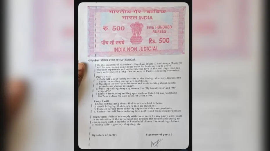 सोशल मीडिया पर वायरल हो रहे कॉन्ट्रैक्ट में लिखा है 'वैलेंटाइन के अवसर पर, शुभम (पार्टी 1) और अनाया (पार्टी 2) दोनों के लिए कुछ घर के रुल तय किए गए हैं ताकि बार-बार होने वाले झगड़ों से बचा जा सके और शादी में प्यार को फिर से जगाया जा सके, जो पार्टी 1 के ट्रेडिंग की आदत के कारण लंबे समय से सफर कर रहा है।' इसके बाद पार्टी के लिए पार्टी 1 के लिए जो नियम लिखे गए हैं उसमें लिखा है, 'शुभम को अनन्या को "माई ब्यूटीकॉइन" और "माई क्रिप्टोपी" जैसे नामों से पुकारना बंद करना होगा। शुभम को रात 9 बजे के बाद ट्रेडिंग ऐप का उपयोग करना और कॉइन रिसर्च के लिए YouTube पर वीडियो देखना छोड़ना होगा।' वहीं कॉन्ट्रैक्ट में पार्टी 2 के लिए लिखा, 'माँ से शुभम की शरारतों के बारे में शिकायत न करना, बहस के दौरान उसकी एक्स का जिक्र न करना और स्विगी/ज़ोमैटो से महंगे स्किनकेयर प्रोडक्ट और देर रात का खाना ऑर्डर करने से खुद को रोकना होगा।'