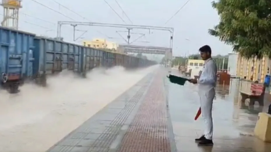 पानी भरे रेलवे ट्रैक पर ड्राइवर ने दौड़ाई ट्रेन