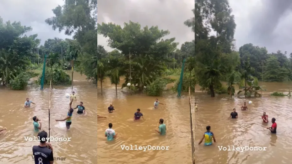 सोशल मीडिया पर वॉलीबॉल खेलते हुए लड़कों का वीडियो खूब वायरल हो रहा है। वीडियो में देखा जा सकता है कि लड़के कमर तक भरे बारिश के पानी में वॉलीबॉल खेल रहे है और खूब एन्जॉय कर रहे है। मैदान पूरी तरह लबालब पानी से भरा हुआ है। मानो जैसे कोई नदी हो। पानी भरे इस मैदान में लड़के बिना परवाह किए बिंदास होकर वॉलीबॉल खेल रहे हैं।