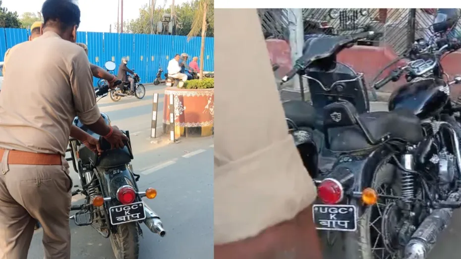 वाराणसी: यूपी के वाराणसी से एक चौंकाने वाला मामला सामने आया है। यहां एक बुलेट पर नंबर प्लेट की जगह "UGC K बाप" लिखा हुआ था। इसके बाद पुलिस ने बुलेट को कब्जे में ले लिया और बुलेट मालिक की सारी हेकड़ी निकालते हुए वाहन को थाने भेज दिया।