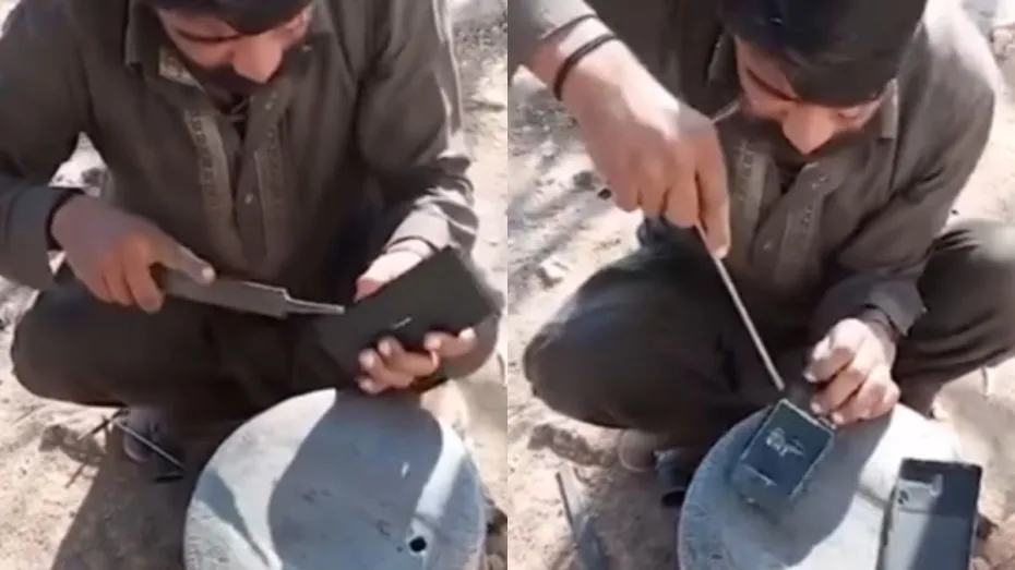 वायरल वीडियो में आप देख सकते हैं कि एक शख्स अपना मोबाइल रिपेयर कराने के लिए एक ठठेरे के पास पहुंचता है और कहता है कि ये मोबाइल ठीक कराना है। ठठेरा उसे मना नहीं करता बल्कि उसका फोन लेकर उसे ठीक करने में लग जाता है। सबसे पहले ठठेरा अपने औजार निकालता है और उनसे मोबाइल को खोलने लगता है। मोबाइल को खोलने के लिए वह संड़सी और बड़े-बड़े स्क्रू ड्राइवर्स का इस्तेमाल करता है। फिर वह मोबाइल को खोलकर उसकी बैटरी निकालता है और पूछता है कि क्या आपको यह मोबाइल पूरी तरह से सही करवाना है? जिस पर शख्स जवाब देता है कि हां जी पूरा ठीक करवाना है। इसके बाद वह ठठेरा मोबाइल के ग्लास फोल्डर को खोलकर देखने लगता है। इसके लिए वह अपने हथौड़े से मोबाइल पर मारता है और मोबाइल के स्क्रीन फोल्डर को खोल देता है। जब वह मोबाइल के स्क्रीन फोल्डर को खोल देता है तब उस शख्स को बताता है कि इसका तो पैनल टूटा है यार।