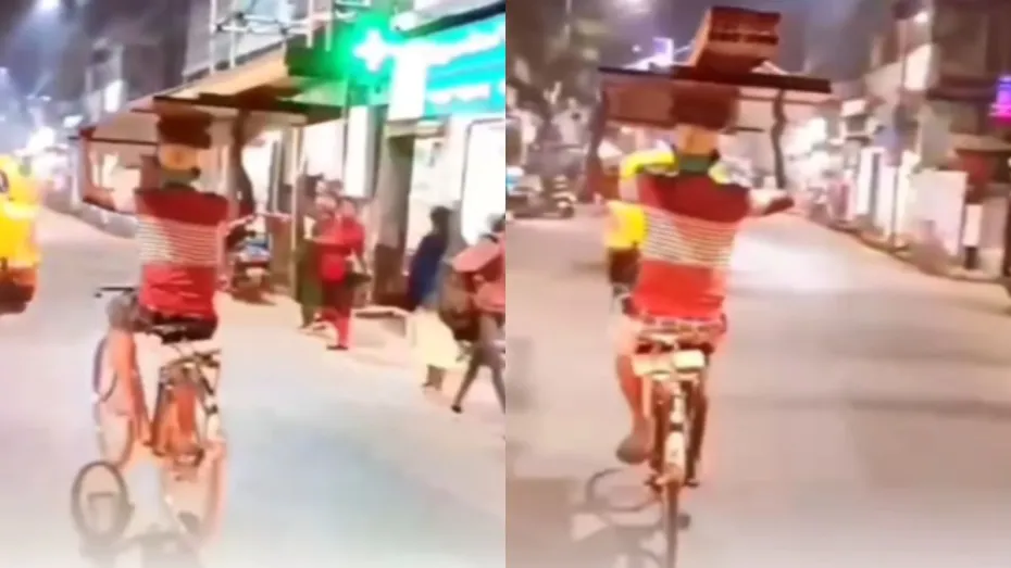 वायरल हो रहे वीडियो में नजर आता है कि सड़क पर एक शख्स अपने साइकिल से कहीं जा रहा है। मगर इस वीडियो में दो अलग-अलग बाते हैं जो आपको हैरान करेगी। पहली हैरान करने वाली बात यह है कि शख्स साइकिल का हैंडल पकड़े बिना साइकिल को बड़े ही आराम से चला रहा है। आपने भी हैंडल छोड़कर साइकिल चलाते हुए कई लोगों को देखा होगा। मगर दूसरी हैरान करने वाली बात आपने किसी और में नहीं देखी होगी। शख्स ने अपने सिर पर कुछ सामान को रखा है जिसे उसने अपने हाथों से पकड़ा हुआ है। ऐसे में साइकिल को बैलेंस कर पाना बहुत मुश्किल है मगर यह शख्स बड़े ही आराम से साइकिल को चला रहा है। आप ऐसा करने की कोशिश ना करें क्योंकि इसके लिए बहुत अभ्यास की जरूरत है।