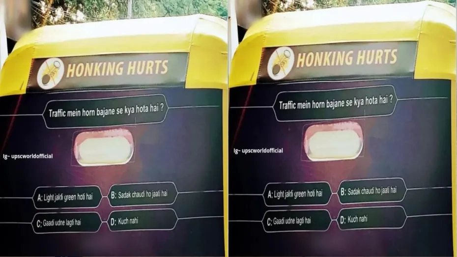 दरअसल, ऑटोवाले ने अपने ऑटो पर KBC थीम पर बेस्ड एक पोस्टर अपने ऑटो पर चिपकाए हुए है। इस पोस्टर में लोगों से एक सवाल पूछा गया है। सवाल ये है कि, "ट्रैफिक में हॉर्न बजाने से क्या होता है?" इस सवाल के लिए लोगों को 4 ऑप्शन भी दिए गए हैं। ऑप्शन A है - लाइट जल्दी ग्रीन होती है, ऑप्शन B है - सड़क चौड़ी हो जाती है, ऑप्शन C है - गाड़ी उड़ने लगती है और लास्ट ऑप्शन D है - कुछ नहीं। ऑटो वाले का यह सवाल उन लोगों को शर्मिंदा करने के लिए है। जो लोग ट्रैफिक में खड़े होने के बाद भी लगातार हॉर्न बजाते रहते हैं।