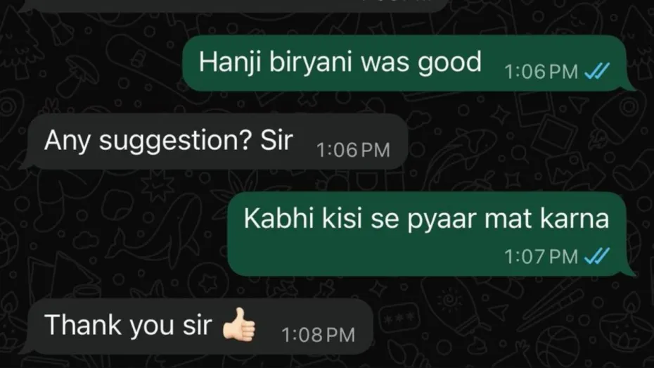 अभी जो स्क्रीनशॉट वायरल हो रहा है वो व्हाट्सएप का है। उसमें नजर आता है कि फूड डिलीवरी बॉय ने खाने की डिलीवरी करने के बाद मैसेज किया कि आपका खाना डिलीवर हो गया है। इसके बाद कस्टमर मैसेज करता है कि हां, बिरयानी अच्छी थी। अब इसके बाद डिलीवरी बॉय उससे सलाह मांगता है कि अगर कोई कमी होगी तो सुधारा जा सकता है। कंपनी को फीडबैक देने में भी मदद करेगा मगर कस्टमर लिखता है, 'कभी किसी से प्यार मत करना।' यह पढ़ने के बाद वो धन्यवाद लिखकर बात खत्म कर देता है।