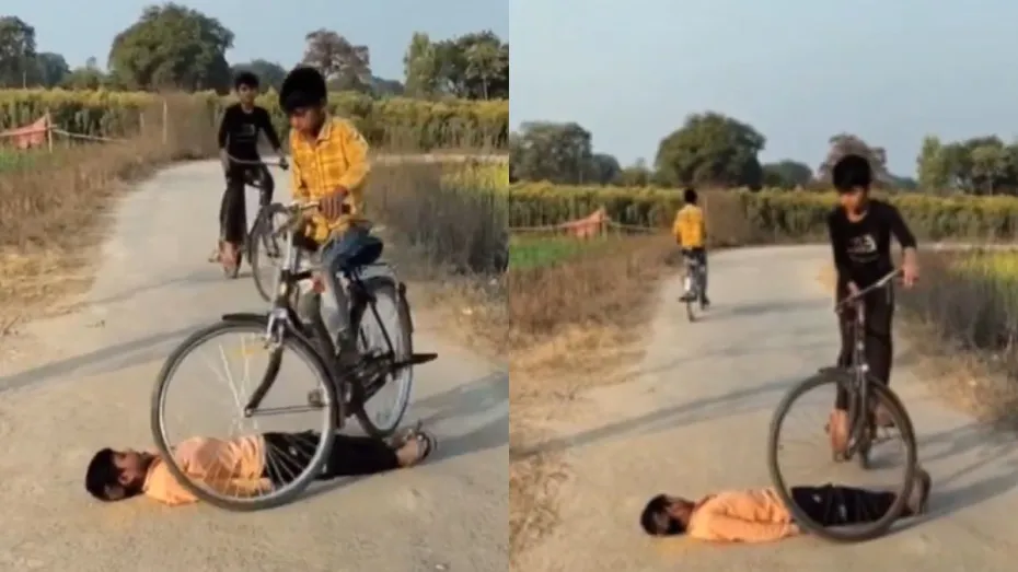अभी जो वीडियो वायरल हो रहा है उसमें नजर आता है कि एक खाली कच्ची सड़क पर एक लड़का बिल्कुल सीधे लेटा हुआ है। वहीं एक दूसरा लड़का साइकिल चलाते हुए आता है और उसके पैरे के पास से साइकिल के आगे वाले पहिए को निकालता है और मोड़ने लगता है। अब साइकिल का एक पहिया उस लड़के के शरीर के दूसरी तरफ और दूसरा पहिया दूसरी तरफ है। लड़का लेटा हुआ है और उसका दोस्त उसे बिना चोट पहुंचाए साइकिल को वहां से मोड़ लेता है। इसके बाद उसका दूसरा दोस्त भी उसी तरह से साइकिल को चलाता है। वीडियो अभी सोशल मीडिया पर खूब वायरल हो रहा है।
