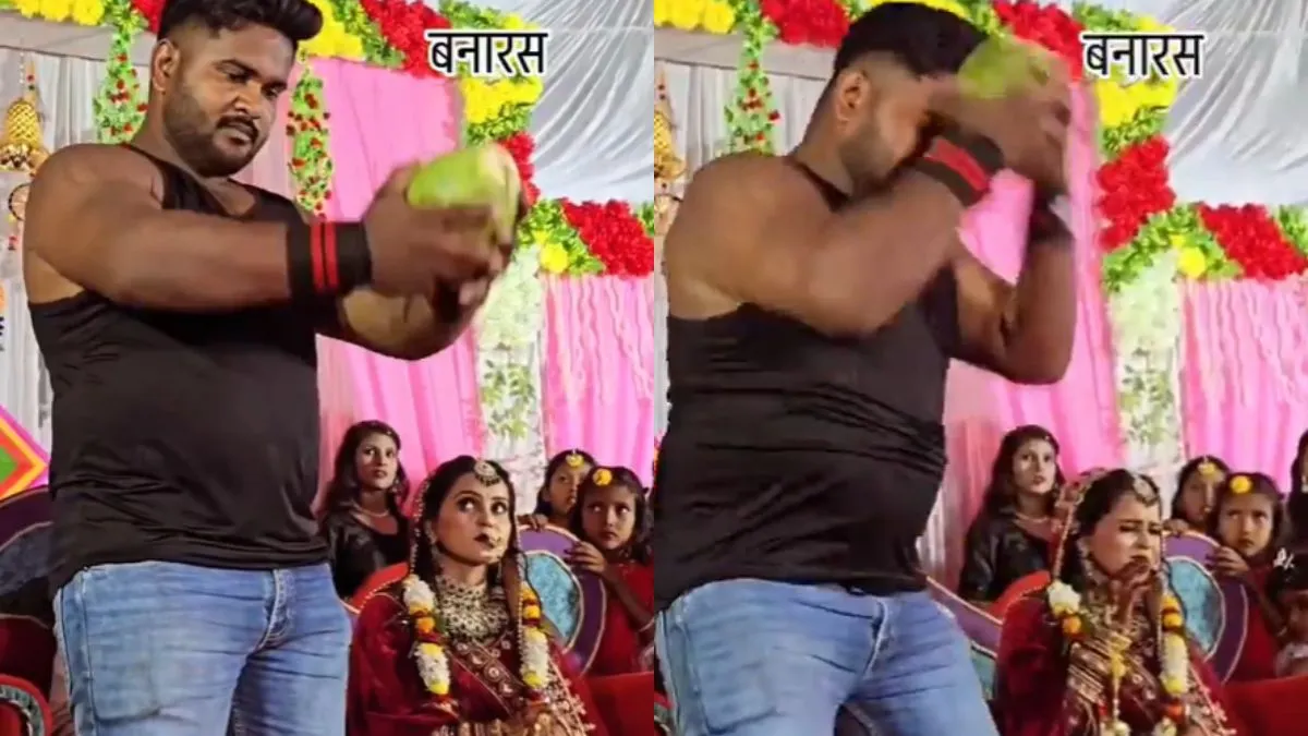 दरअसल, इस बार एक शादी में एक “मूसलपहल” ने शादी के स्टेज को ही अपना पावरहाउस का रिंग बना डाला। वायरल हो रहे वीडियो में एक चमचमाते शादी का स्टेज दिखाया गया है, जहाँ फूलों की मालाएँ, रंग-बिरंगी लाइट्स और बीच में दूल्हा-दुल्हन हैं। माहौल काफी खुशनुमा दिख रहा है, लेकिन तभी स्टेज पर एक पहलवान की धमाकेदार एंट्री होती है, जहाँ वे भाईसाब! हाथ में नारियल लिए दिख रहे हैं। इस दौरान पहलवान का चेहरा ऐसा है जैसे वे महाभारत का कोई सीन रीक्रिएट करने आए हों। फिर क्या, बस भाईसाहब बिना किसी देरी के नारियल उठाते हैं और ठकाठक अपने सिर से नारियल फोड़ने लगते हैं।