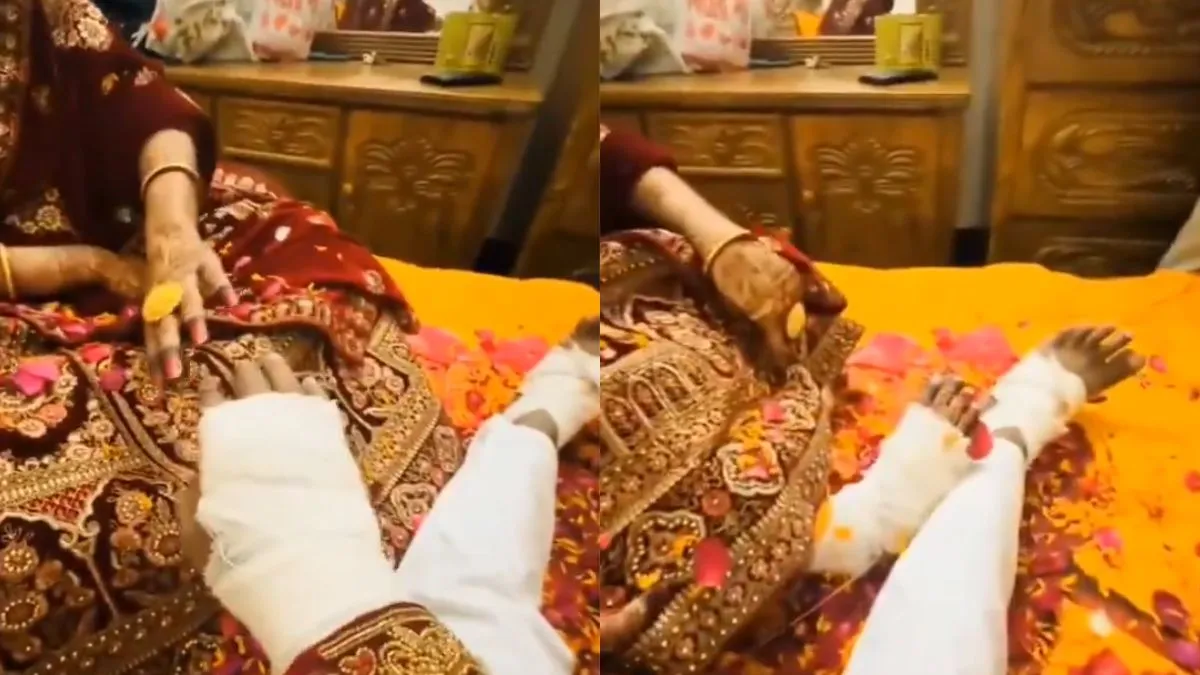 सोशल मीडिया पर हर कुछ दिनों में कुछ ऐसे वीडियो वायरल होते हैं जिन्हें मजाकिया तौर पर लोग अपने कपल गोल्स बताते हैं। उसी क्रम में अभी भी एक वीडियो वायरल हो रहा है। अभी जो वीडियो वायरल हो रहा है उसमें नजर आता है कि दूल्हा के हाथ में पट्टियां बंधी हुई हैं। उसके पैर में भी पट्टियां बंधी हुई हैं और वहां दुल्हन के भी एक पैर में पट्टी बंधी हुई है। अब उनके साथ कैसे हादसा हुआ, यह तो नहीं पता मगर इसका वीडियो बनाकर पोस्ट किया और वो 'कपल गोल्स' के नाम पर वायरल हो गया। अलग-अलग अकाउंट से खूब शेयर किया जा रहा है।