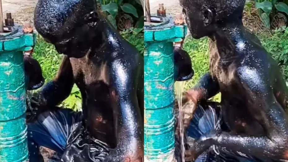 अभी जो वीडियो वायरल हो रहा है उमसें नजर आता है कि एक आदमी किसी हैंडपंप के पास बैठा हुआ है। वो सिर से लेकर कमर तक पूरा काला नजर आ रहा है। उसके ऊपर शायद कोई ऑयल डाल दिया है जो उसके शरीर पर बुरी तरह से लग गया है। उसके शरीर पर से पानी फिसलते हुए गिर रहा है। वो अपने मुंह पर पानी फेंक रहा है लेकिन वो रंग हटने को तैयार नहीं। अब यह शख्स कौन है, वीडियो कहां का है, इसकी जानकारी तो नहीं दी गई है मगर वीडियो जमकर वायरल हो रहा है।