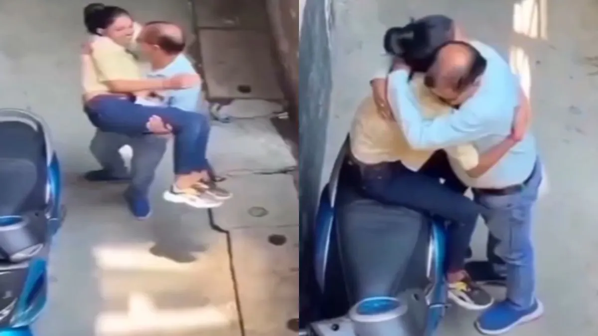 अभी जो वीडियो वायरल हो रहा है उसमें नजर आता है कि एक लड़की स्कूटी के पास खड़ी है और एक तरफ से अंकल चलते हुए आते हैं। अंकल के आते ही लड़की उनके पास जाती है और दोनों गले लग जाते हैं। इसके बाद अंकल उस लड़की को गोद में उठा लेते हैं और फिर स्कूटी पर बैठा देते हैं और खुद उस लड़की के सामने घुटनों पर बैठ जाते हैं। इसके बाद वो उठकर फिर से लड़की को गले लगाते हैं और फिर हाथ पकड़कर खड़े ही थे कि कोई उनपर पानी फेंक देता है। पानी फेंकने के तुरंत बाद वो दोनों वहां से भाग जाते हैं।