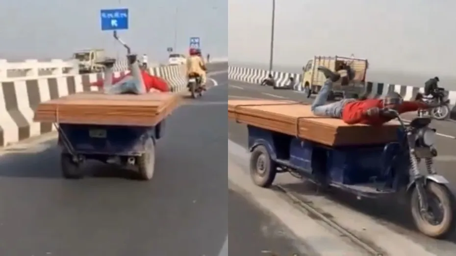 कार हो, बाइक हो, रिक्शा हो, ट्रक हो या फिर कोई दूसरा वाहन हो, हर किसी को चलाने के लिए एक ड्राइविंग सीट दी जाती है। चालक उस सीट पर बैठे वाहन को चलाता और कंट्रोल करता है। लेकिन सोशल मीडिया पर जो वीडियो वायरल हो रहा है, उसमें कुछ अलग ही दिखा। दरअसल एक ई-रिक्शा लोडर पर प्लाईवुड रखने के बाद चालक के बैठने की जगह ही नहीं बची। मतलब प्लाईवुड ने उसकी सीट की जगह भी कवर कर ली। इसके बाद वो प्लाईवुड पर लेट गया और वैसे ही रिक्शा को चलाने लगा जिसका वीडियो खूब वायरल हो रहा है।