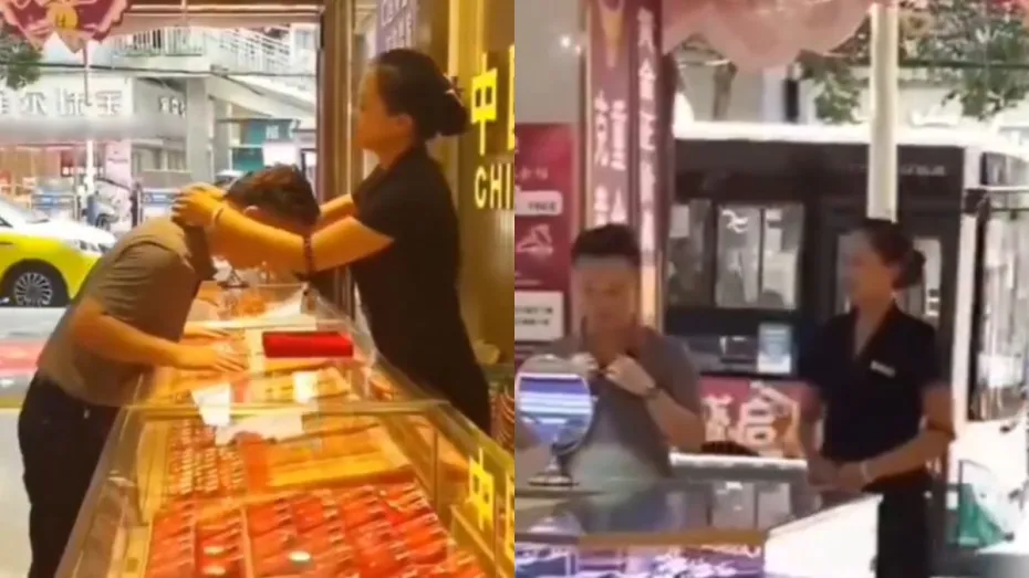 अभी जो वीडियो वायरल हो रहा है उसमें नजर आ रहा है कि एक ज्वेलरी शॉप जहां महिला कर्मचारी है, वहां एक शख्स अपने लिए चैन खरीदने गया है। महिला उसके गले में चैन पहनाती है और इसके तुरंत बाद वो वहां से भागता है। महिला को लगता है कि वो भाग रहा है तो वो भी तुरंत छलांग लगाकर उसका पीछा करती है। मगर वो आदमी दुकान के बाहर नहीं गया बल्कि भागकर शीशे के पास गया और देखने लगा कि चैन कैसा लग रहा है। महिला यह देखकर हंसने लगती है। वीडियो चीन का लगता है क्योंकि दुकान का नाम चाइना से शुरू होता है।