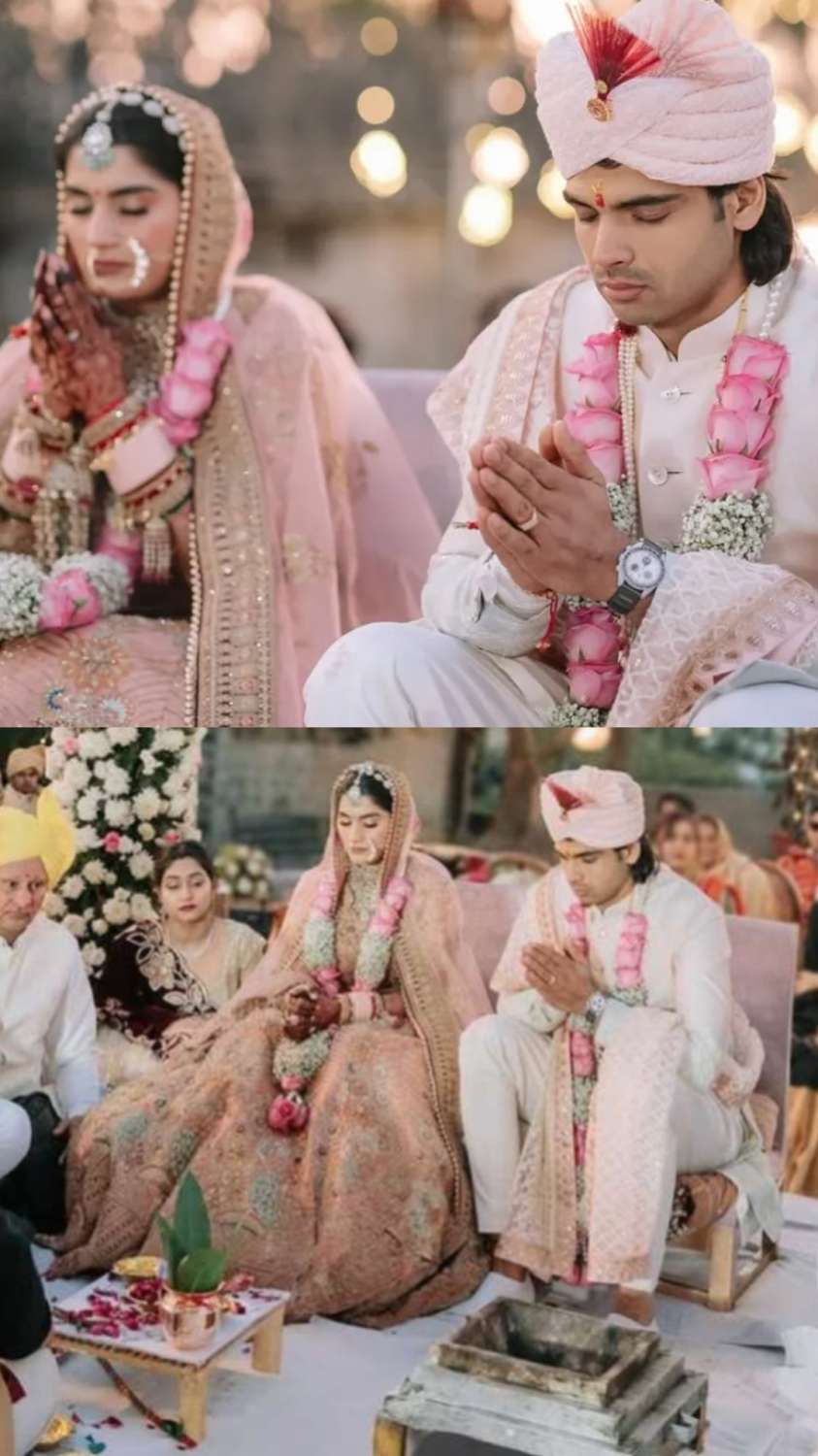Image Source : socialनीरज चोपड़ा और उनकी पत्नी हिमानी पेस्टल पिंक वेडिंग लुक में बेहत खूबसूत लग रहे हैं।