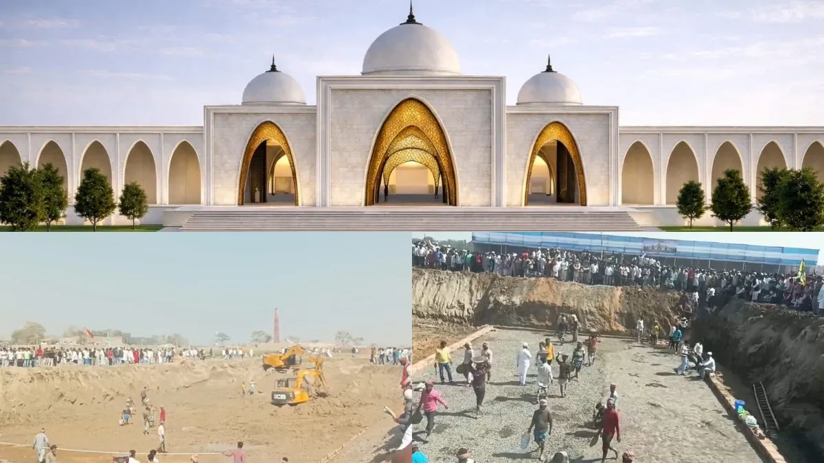 मस्जिद निर्माण स्थल से सामने आए वीडियो में बड़े पैमाने पर हो रही गतिविधियों की झलक दिखी। हजारों की भीड़ जुटी है और जेसीबी मशीनों के जरिए नींव के लिए मिट्टी हटाने का काम चल रहा है। एक तरफ तकनीकी टीम जमीन की नपाई और सटीक मार्किंग में जुटी है, वहीं दूसरी ओर बड़ी संख्या में श्रमिक सीमेंट और बालू पहुंचाने के काम में लगे हैं।