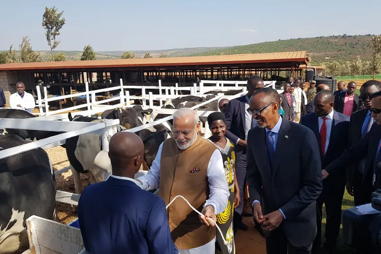 नई दिल्ली: प्रधानमंत्री नरेंद्र मोदी ने मंगलवार को रवांडा में एक गांव का दौरा किया और पूर्वी अफ्रीकी राष्ट्र की आर्थिक विकास परियोजना के लिए 200 गायों को दान में दिया। विदेश मंत्रालय के प्रवक्ता रवीश कुमार ने ट्वीट किया, "रवांडा के आर्थिक विकास की दिशा में एक परिवर्तनीय परियोजना का हिस्सा बने।"