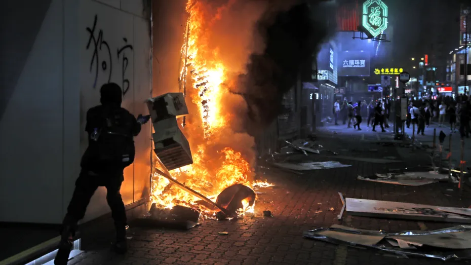 पहले की ही तरह रैली शांतिपूर्ण तरीके से शुरू हुई लेकिन कट्टर प्रदर्शनकारियों की ओर से पुलिस और सबवे के प्रवेश द्वार पर पेट्रोल बम फेंकने एवं चीन की बैंक शाखाओें एवं दुकानों पर हमले के बाद अराजक स्थिति पैदा हो गई। इसके जवाब में पुलिस ने आंसू गैस के गोले और रबर की गोलियां चलाने के साथ लाठीचार्ज किया। पूरे दोपहर नाथन रोड पर पानी की बौछार करने वाले ट्रक प्रदर्शनकारियों का पीछा करते रहे और उनपर नीले रंग के पानी की बौछार करते रहे ताकि बाद में उनकी पहचान की जा सके। वहीं प्रदर्शनकारियों ने पुलिस की ओर से लगाए गए अवरोधकों में आग लगा दी।