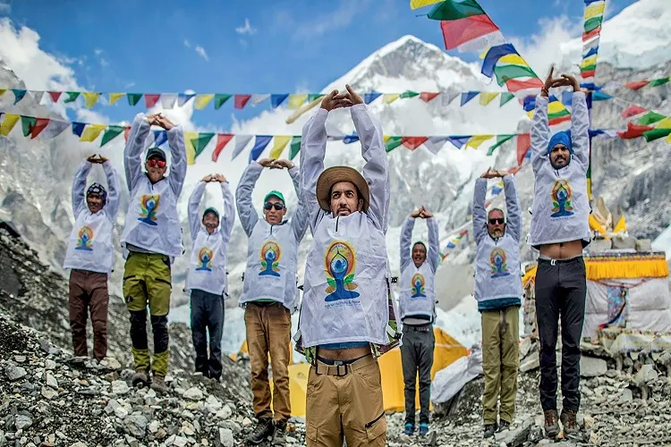 बयान के अनुसार गुजरात के पर्वतारोही भारत शर्मा ने अन्य पर्वतारोहियों के साथ समुद्र से 17,600 फुट की ऊंचाई पर दुनिया की सबसे ऊंची चोटी के आधार शिविर में योगाभ्यास कर इतिहास रचा। अंतरराष्ट्रीय योग दिवस हर साल 21 जून को मनाया जाता है। वर्ष 2015 में इसकी शुरुआत हुई थी।
