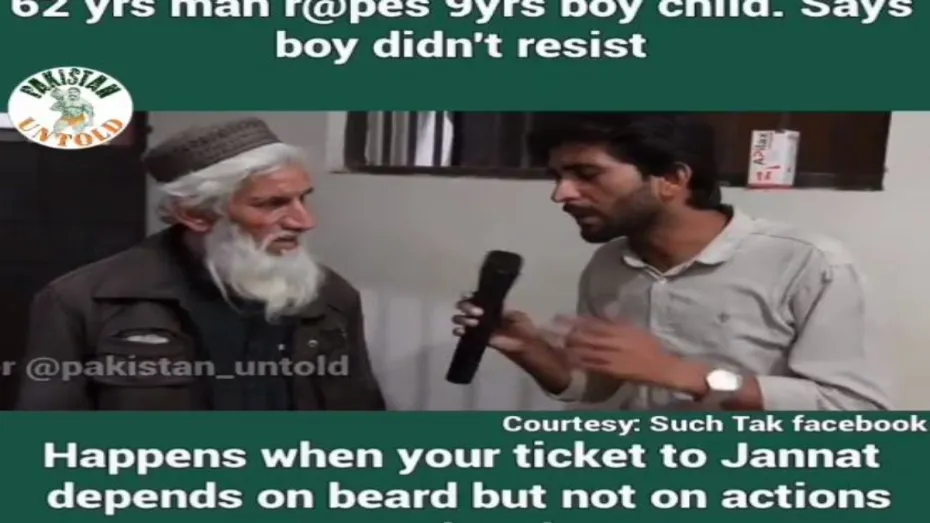 पाकिस्तान: बेशर्मी की भी हद होती है। पाकिस्तान का एक वीडियो वायरल हो रहा है जिसमें एक 62 साल के बुजुर्ग ने अपने ही रिश्तेदार के 10 साल के एक लड़के साथ कथित तौर पर रेप किया और फिर कैमरे के सामने अपना जुर्म भी कबूला है। आरोपी बुजुर्ग ने बेशर्मी से कहा कि जब मैंने बच्चे के ऊपर हाथ फेरा तो उसने कुछ नहीं कहा था, वो चुपचाप था। बुजुर्ग ने ये बात इतनी ढिठाई से कही जैसे ऐसा कर उसने कोई गलत काम नहीं किया हो। उसे अपनी गलती का किसी तरह का पछतावा नहीं है।