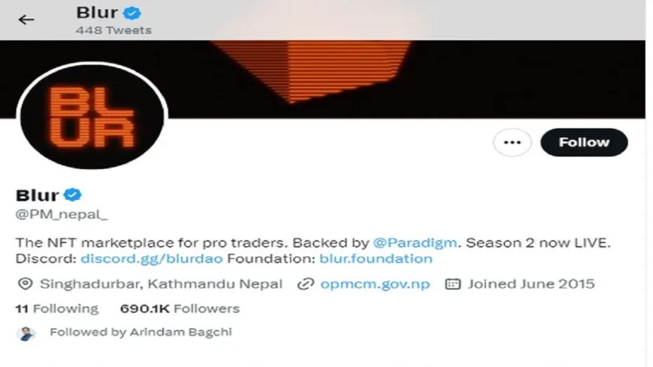 काठमांडू: नेपाल के प्रधानमंत्री पुष्प कमल दहल प्रचंड का ऑफिशियल ट्विटर हैंडल @PM_Nepal गुरुवार सुबह हैक कर लिया गया। उनके ट्विटर अकाउंट में दहल के प्रोफाइल की जगह BLUR अकाउंट दिख रहा है जो प्रो ट्रेडर्स के लिए नॉन-फंजिबल टोकन मार्केटप्लेस है। हैकर्स ने पीएम के ट्विटर अकाउंट से डिजिटल करेंसी को प्रमोट करने से संबंधित मैसेज ट्वीट किया। पीएम दहल के ट्विटर अकाउंट @PM_Nepal पर एनएफटी के संबंध में एक ट्वीट को पिन किया गया है। जिसमें लिखा है, "तलब करना शुरू कर दिया गया है। अपना BAKC या SewerPass तैयार रखें और गड्ढे में उतरें! https://thesummoning.party।"