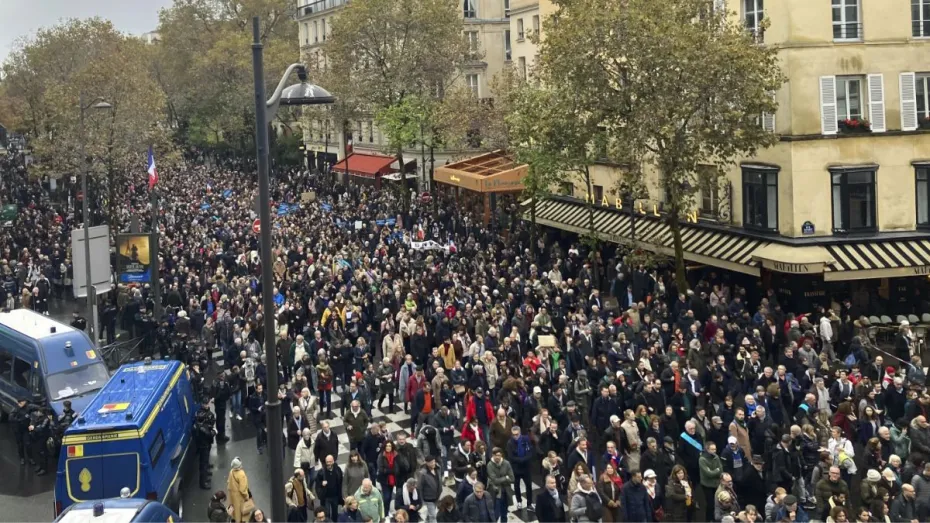 फ्रांस में रविवार को 1,80,000 से अधिक लोगों ने शांतिपूर्ण तरीके से मार्च निकाला। अकेले पेरिस में ही एक लाख लोग मार्च के लिए एकत्र हुए। कड़ी सुरक्षा के बीच प्रधानमंत्री एलिजाबेथ बोर्न, कई वामपंथी दलों के प्रतिनिधि, राष्ट्रपति इमैनुएल मैक्रों की पार्टी के रूढ़िवादी और मध्यमार्गी, धुर दक्षिणपंथी नेता मरीन ले ने भी फ्रांस की राजधानी में रविवार को हुए इस मार्च में भाग लिया।