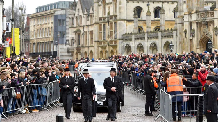 लंदन: ब्रिटिश भौतिक विज्ञानी स्टीफन हॉकिंग के शनिवार को हुए अंतिम संस्कार में उन्हें श्रद्धांजिल देने के लिए हजारों लोग कैंब्रिज पहुंचे। हॉकिंग को ब्रह्मांड की जटिल गुत्थियों को सुलझाने, ब्लैक होल और सिंगुलैरीटी तथा सापेक्षता के सिद्धांत के क्षेत्र में अपने अनुसंधान के लिए जाना जाता है। कैंब्रिज हॉकिंग का 50 से अधिक वर्षों तक अकादमिक घर रहा है, उनका अंतिम संस्कार स्थानीय समयानुसार दोपहर 2 बजे बेहद निजी स्तर पर किया गया। विश्च के मशहूर वैज्ञानिकों और लेखकों में से एक हॉकिंग ने 14 मार्च को 76 वर्ष की उम्र में अपने कैंब्रिज स्थित घर में आखिरी सांस ली थी।