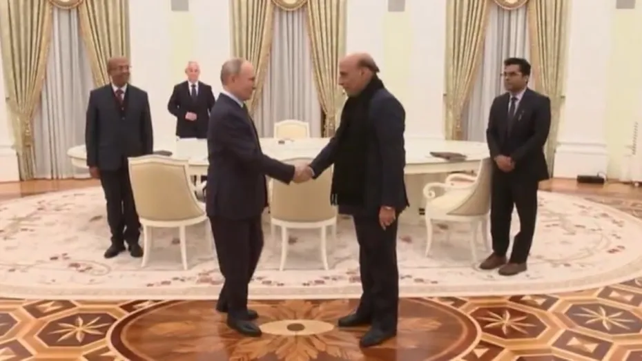 रूस के राष्ट्रपति व्लादिमीर पुतिन ने क्रेमलिन में भारतीय रक्षा मंत्री राजनाथ सिंह से मुलाकात की। इस बैठक में रूस के रक्षा मंत्री आंद्रेई बेलोसोव भी मौजूद थे। यह मुलाकात India-Russia Inter-Governmental Commission on Military and Military Cooperation (IRIGC-M&MTC) की 21वीं बैठक के तहत हुई। रक्षा मंत्रालय के अनुसार, इस बैठक में दोनों नेताओं ने द्विपक्षीय रक्षा सहयोग के विभिन्न पहलुओं पर चर्चा की। दोनों ने यह माना कि भारत और रूस के बीच साझेदारी में अपार संभावनाएं हैं और संयुक्त प्रयासों से उल्लेखनीय परिणाम प्राप्त होंगे।