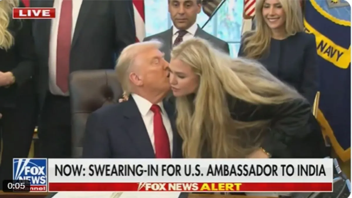 वाशिंगटनः अमेरिकी राष्ट्रपति डोनाल्ड ट्रंप का एक वीडियो सोशल मीडिया पर वायरल हो गया है, जिसमें उन्होंने कंजर्वेटिव एक्टिविस्ट चार्ली किर्क की विधवा एरिका किर्क को ओवल ऑफिस में सार्वजनिक रूप से किस किया। यह घटना सोमवार दोपहर को हुई, जब ट्रंप भारत के लिए अमेरिकी राजदूत के रूप में सर्जियो गोर के शपथ ग्रहण समारोह में मौजूद थे। वीडियो में ट्रंप एरिका को बुलाते दिखे, फिर उनके गाल पर किस किया। इस दौरान ओवल ऑफिस में दर्जनों लोग मौजूद थे। इसके बाद यह वीडियो तेजी से सोशल मीडिया पर वायरल हो गया, जिसने सनसनी फैला दी है।