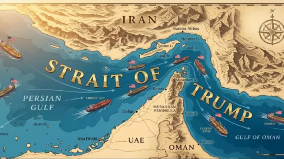 वॉशिंगटन: अमेरिका के राष्ट्रपति डोनाल्ड ट्रंप ने गुरुवार को एक तस्वीर शेयर की जिसमें एक बदला हुआ नक्शा दिखाया गया था। इस नक्शे में 'स्ट्रेट ऑफ होर्मुज' का नाम बदलकर 'स्ट्रेट ऑफ ट्रंप' कर दिया गया था। ट्रंप ने यह तस्वीर अपने सोशल मीडिया प्लेटफॉर्म ट्रुथ सोशल अकाउंट पर बिना किसी कैप्शन के पोस्ट की। यह तस्वीर असल में 'IStandWithTrump47' नाम के एक अकाउंट ने शेयर की थी जिसमें जलमार्ग के असली नाम की जगह 'स्ट्रेट ऑफ ट्रंप' लिख दिया गया था। स्ट्रेट ऑफ होर्मुज एक संकरा लेकिन जरूरी समुद्री मार्ग है जिससे दुनिया भर में होने वाली तेल की शिपमेंट का लगभग 5वां हिस्सा गुजरता है।